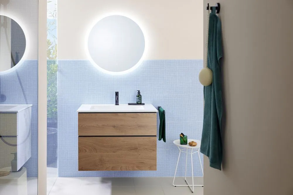 Details wie die fein verarbeiten Laserkanten ohne sichtbare Leimfugen zeigen die gute Verarbeitungsqualität, die auch durch das DGM-Herkunftslabel „Möbel Made in Germany“ unterstrichen wird. Mit der Zertifizierung durch den Blauen Engel ist die Kollektion zudem eine der ganz wenigen Badmöbelserien, die die hohen Anforderungen an Gesundheits- und Umweltverträglichkeit von Deutschlands ältestem und bekanntestem Umweltsiegel erfüllen.